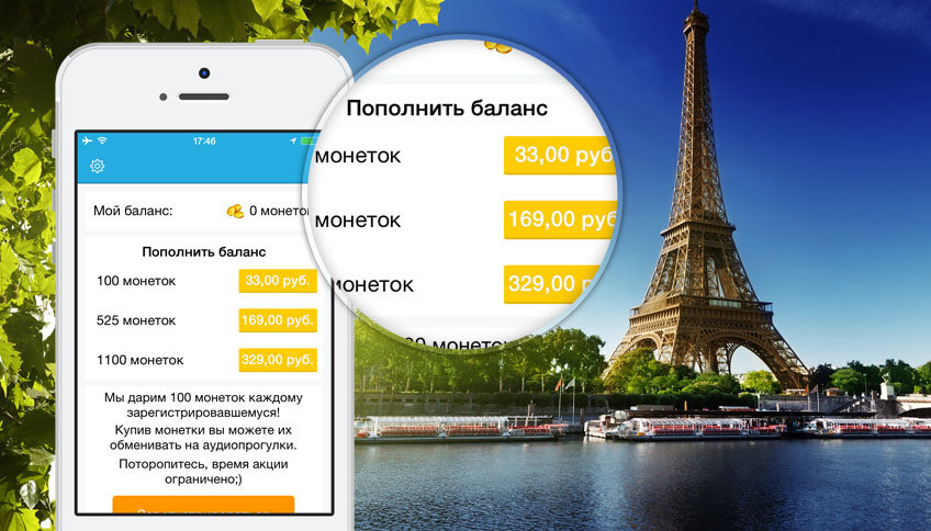Для этого на вашем счету должна находиться достаточная сумма. Пополнить её очень легко: платите 33 рубля и получаете 100 пиастров, 169 рублей – 525 пиастров, 329 рублей – 1100 пиастров. Как видите, у нас бонусная система: чем больше вы положите на счет, тем больше пиастров получите в подарок, а значит, сможете купить больше аудиогидов ;)